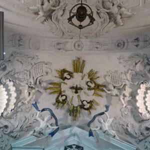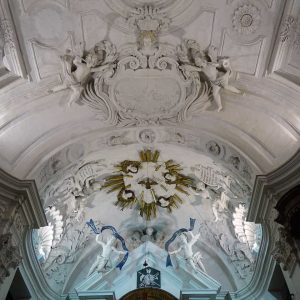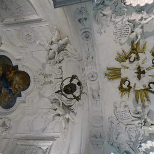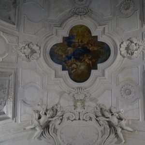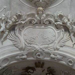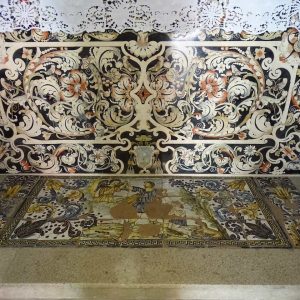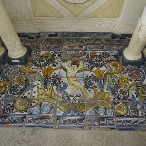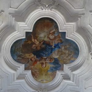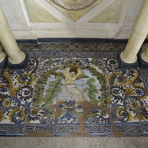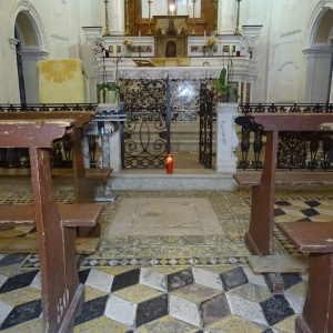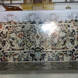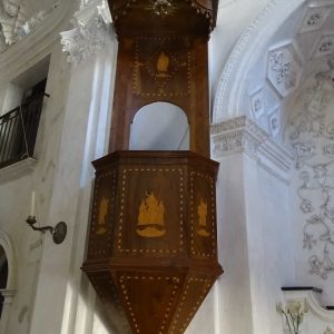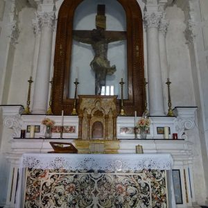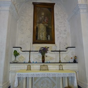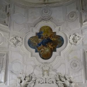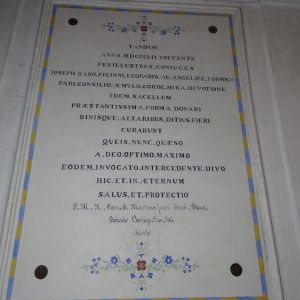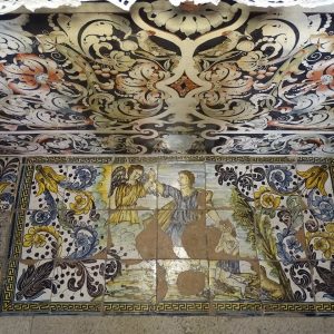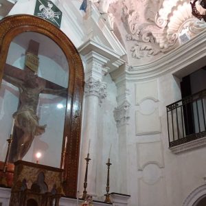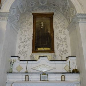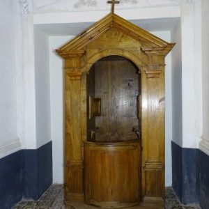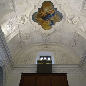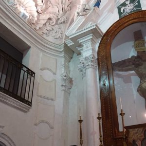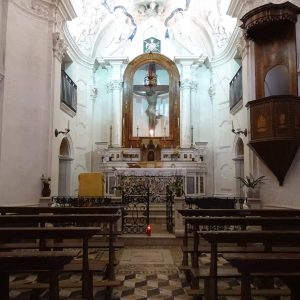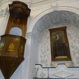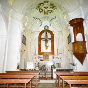 I richiami alla Certosa di San Lorenzo a Padula sono molteplici: dagli ornamenti in stucco , simili alla Cappella del Tesoro, alpavimento maiolicato con motivi fitomorfui e arricchito dall’illustrazi one del sacricio di Isacco, al paliotto in scagliola e madreperla, alle acquasantiere che – come il portale – sono state realizzate in pietra di Padula. Lo stile barocco spagnolo è largamente rappresentato anche qui: lo si ravvisa nel maestoso crocisso del Settecento, nella deliziosa e struggente statua dell’Addolorata e nel pregevole pulpito; tutti scolpiti in legno; oltre che negli stucchi nissimi. La cappella comunica con l’edificio che l’affianca: è a pianta rettangolare, con un’unica navata e un organo settecentesco. APPROFONDISCI.